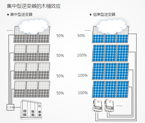 第一,避免了集中型逆变器电站的木桶效应。集中式并网逆变系统中,组件方阵经过两次汇流到达逆变器,逆变器最大功率跟踪功能(MPPT)不能监控到每一路组件的运行情况,因此不可能使每一路组件都处于最佳工作点,当有一块组件发生故障或者被阴影遮挡,会影响整个系统的发电效率。所以当电池组件受到遮挡时,集中型电站会受到较大的影响,组串型电站只有被遮挡的一串对应的一路MPPT受到影响。而正常情况下,各个组件之间的安装间距,安装角度各异,一天中一定时间内不可避免会产生局部遮挡,特别是早晚时刻太阳高度角较低的时候,或者出现一些植被遮挡一些电池片。若一个500KW方阵的电池板使用一路MPPT来跟踪,会损失一定的发电量。该情况同样适用于当电池组件发生脏污、阴影、老化、升温、热斑的情况下。